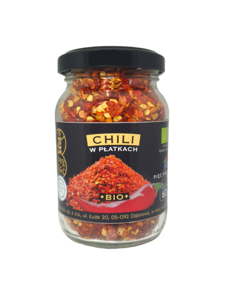 Składniki: Chili w płatkach ekologiczna 100 %.