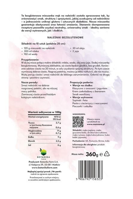 Ta bezglutenowa mieszanka mąk na naleśniki została opracowana tak, by zrównoważyć smak, strukturę i sprężystość, jakiej oczekujemy od naleśników – a jednocześnie unikać glutenu i sztucznych dodatków. Nasza mieszanka gwarantuje elastyczność oraz łatwość smażenia. Starannie skomponowana receptura pozwoliła uzyskać neutralny, uniwersalny smak - idealny zarówno do wersji wytrawnych, jak i słodkich.